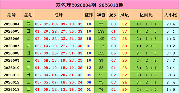 双色球上期开奖号码归来:红球04 09 12 13 16 20;蓝球01,红球号码大小比为1:5,三区比为2:4:0。蓝球开出小奇数01。